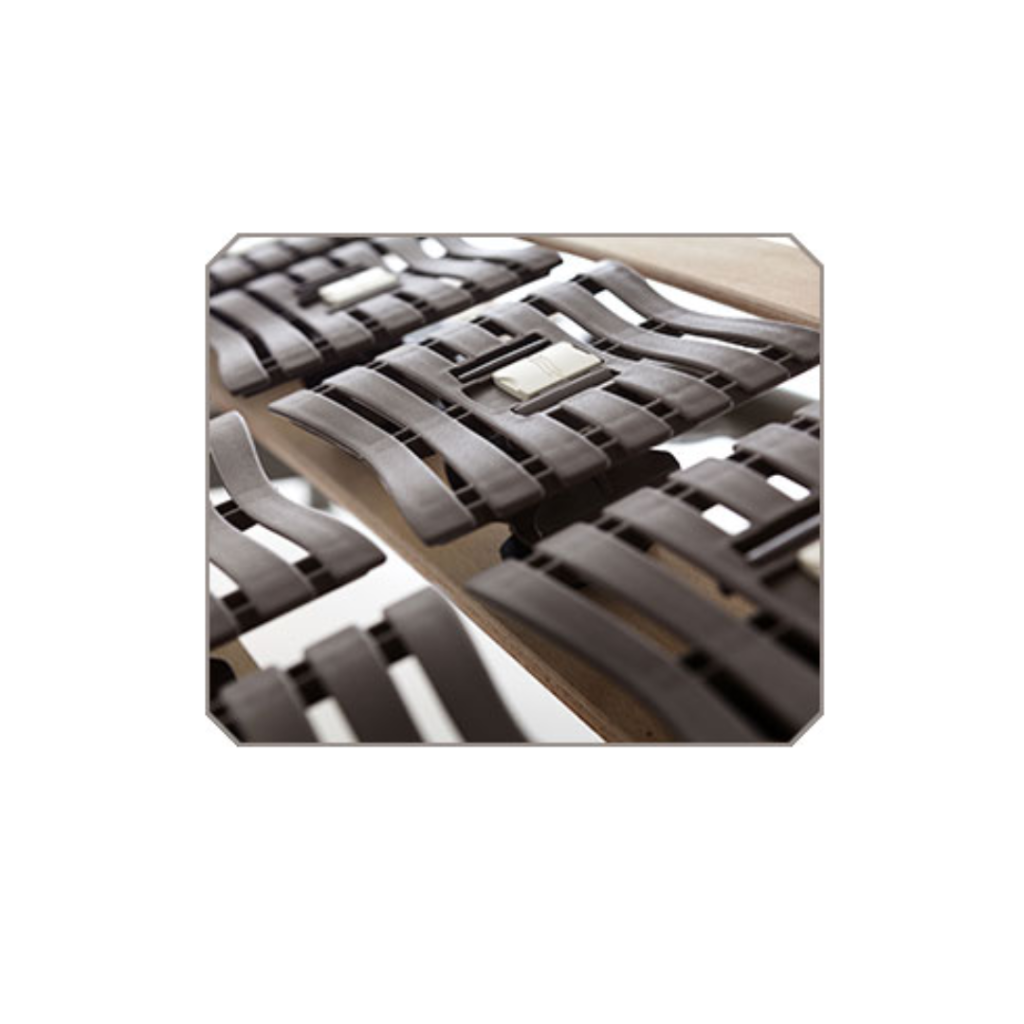 With a steel frame and wooden slats, Fluttua 100 is an anatomical bed base with adjustable slats for varying degrees of support in the lumbar area. These slats are equipped with tilting supports to accommodate the movements of the sleeper and, in the shoulder area, are replaced by shock-absorbing elements to better accommodate the body. Fluttua 100 is available in twin, full, queen and queen XL sizes.