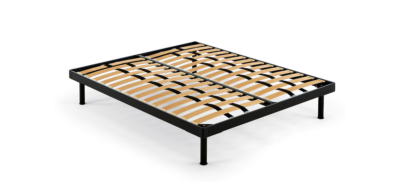 Mattress base with tubular steel frame and wooden sleeping surface, consisting of 14 slats made of beech plywood. Elastic reinforcing straps ensure that this model can support additional weight and offer increased durability. It is available for twin, full, queen size and XL mattresses.