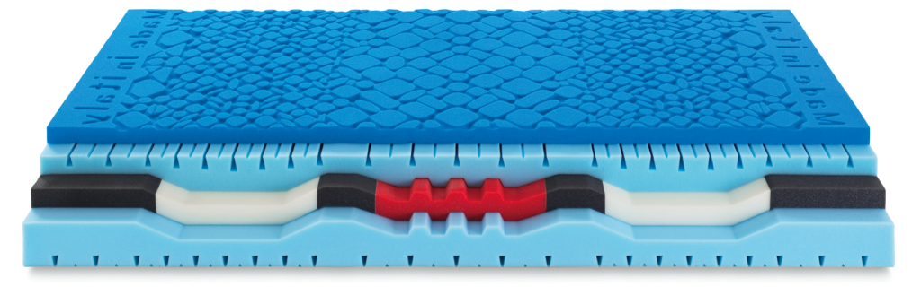 This is followed by a layer of Evocell with different thicknesses for progressive support, and an eco-friendly foam with 7 support zones.