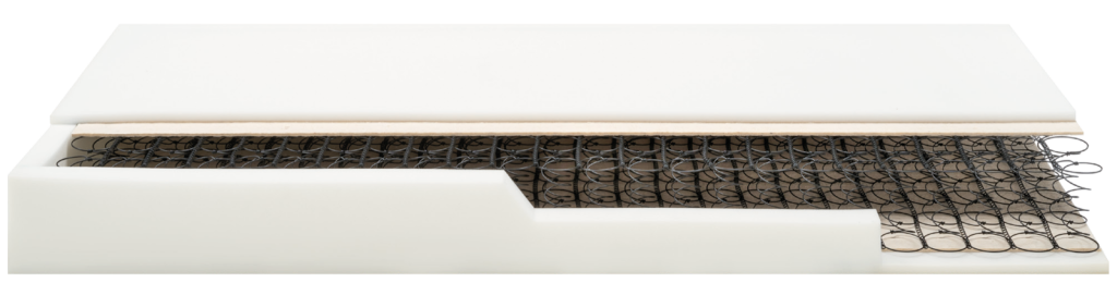 Aurora is equipped with 400 Bonnell springs, providing uniform and continuous support, with firm and resilient lift. The 2 cm embossed Evocell profiles on both sides improve comfort and promote breathability. The box spring completes the structure, offering greater stability.