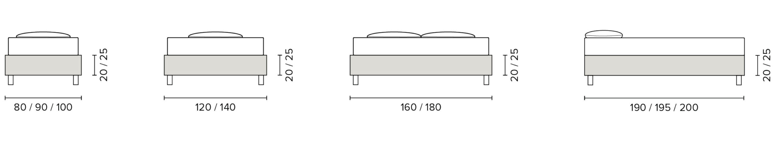 Il sommier Queen si distingue per la sua capacità di adattarsi con eleganza a qualsiasi spazio. Offrendo due diverse altezze (cm. 20 e cm. 25) e la possibilità di scegliere tra due tipi di rivestimento – teso o a balza – questo sommier ha la possibilità di essere personalizzato per soddisfare le esigenze di qualsiasi ambiente.