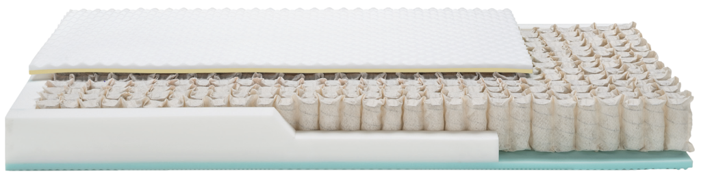 Il profilo superiore in Visco Memory bugnato si adatta al corpo riducendo i punti di pressione, mentre quello inferiore in Evocell, certificato Hygcen®, assicura traspirabilità, igiene e stabilità.