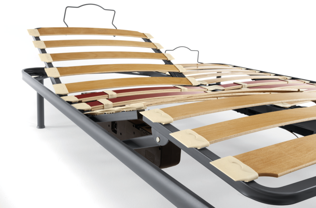 Rete in acciaio con doghe in legno, ancorate con supporti in SBS, motorizzata e reclinabile. La versione matrimoniale dispone di piani di riposo indipendenti a due motori per un riposo particolarmente comodo. La rete con comando a filo di serie o telecomando (optional) è dotata anche di una batteria d’emergenza da usare qualora mancasse la corrente elettrica per riportare il piano di riposo piegato in posizione di partenza. La parte lombare è rinforzata da doghe regolabili per dare maggiore o minor sostegno a seconda delle necessità.